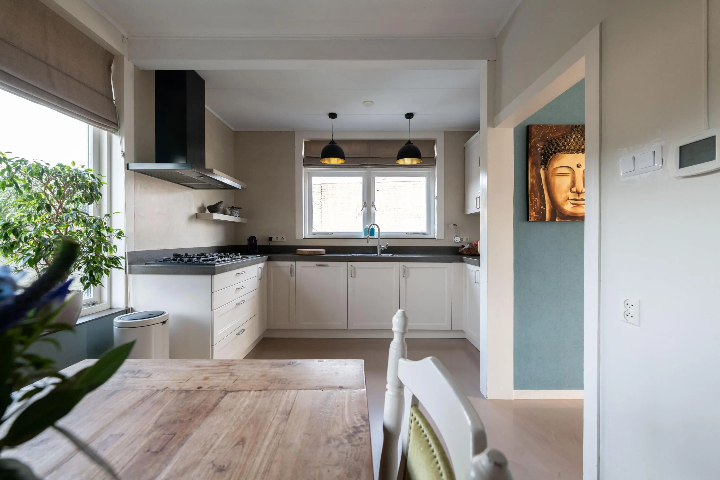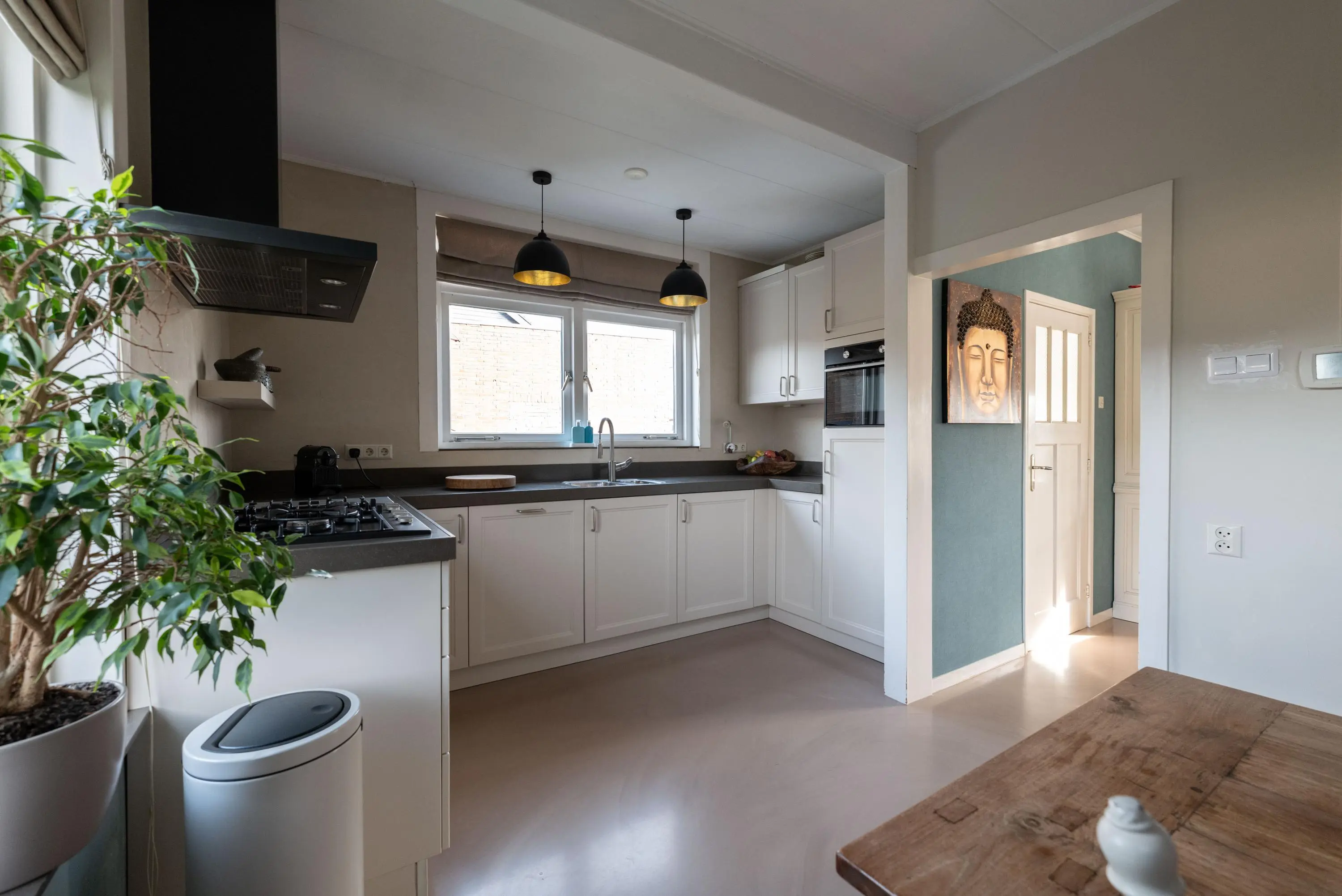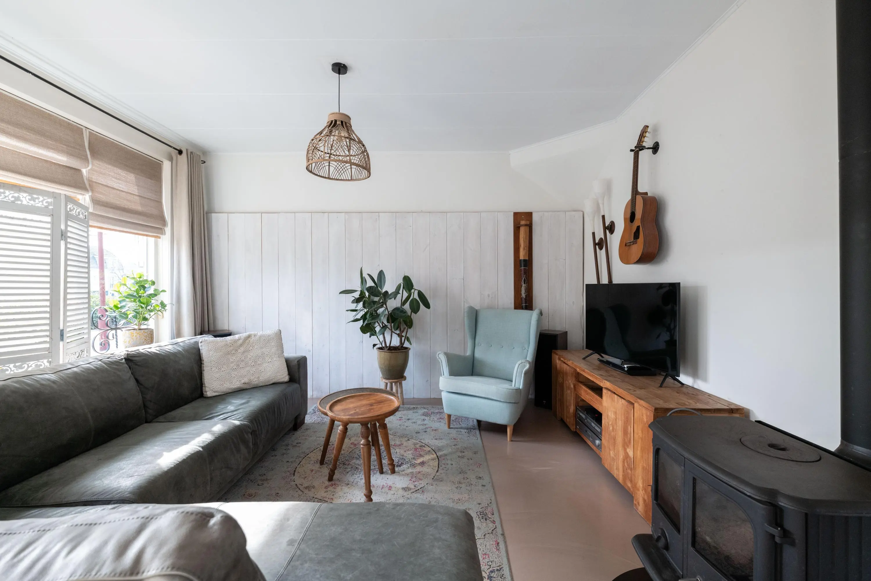 Entree met meterkast en cv-ruimte. Aan de voorzijde is de sfeervolle woonkamer met houtkachel. De gedeeltelijk open keuken is ruim en is in U-opstelling en voorzien van provisiekast. Deze woonkeuken is voorzien van inbouwapparatuur zoals de 5-pits gaskookplaat met afzuigkap, oven, koelkast, vriezer en vaatwasser. Vanaf hier kun je zowel naar de 1e verdieping als het souterrain.