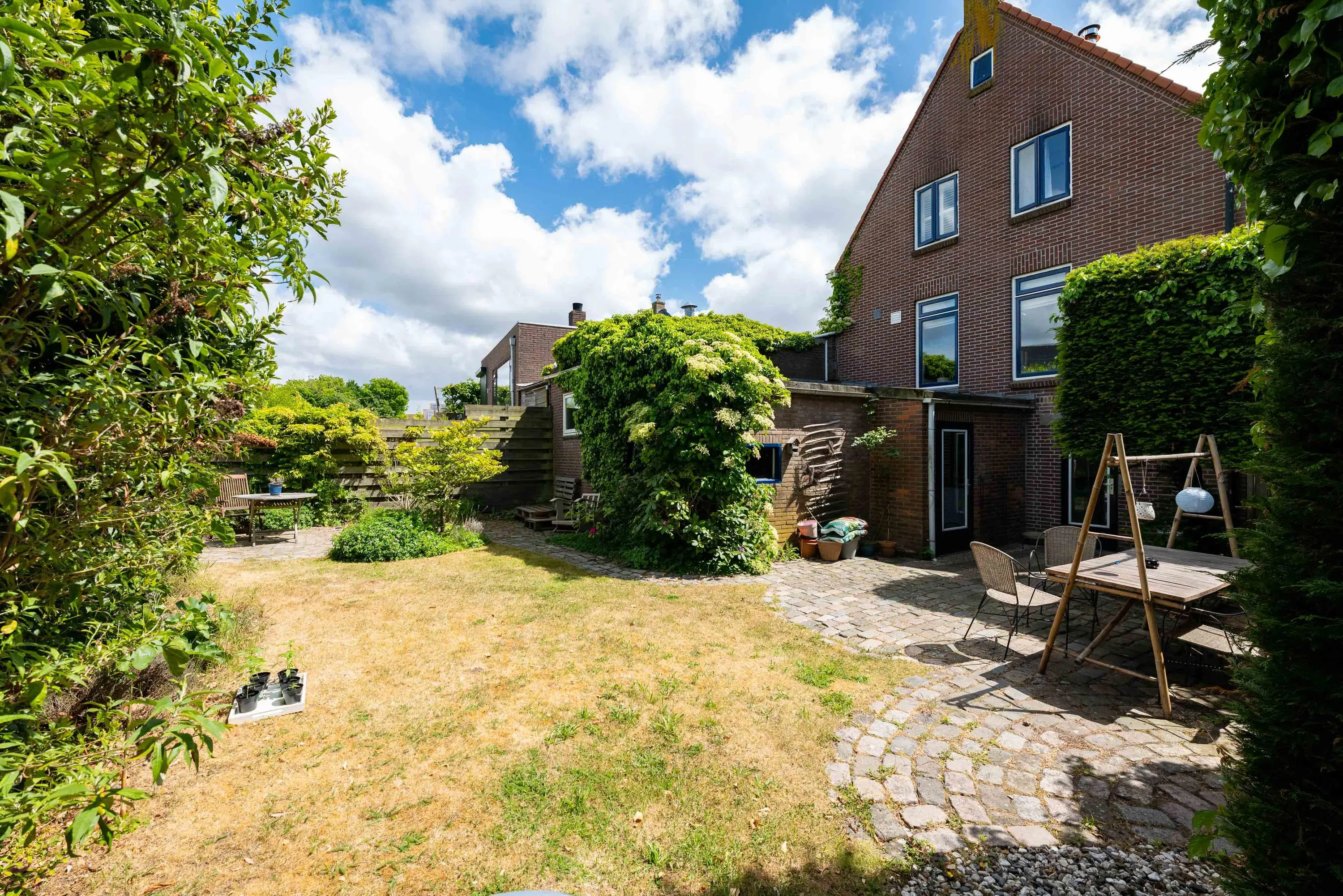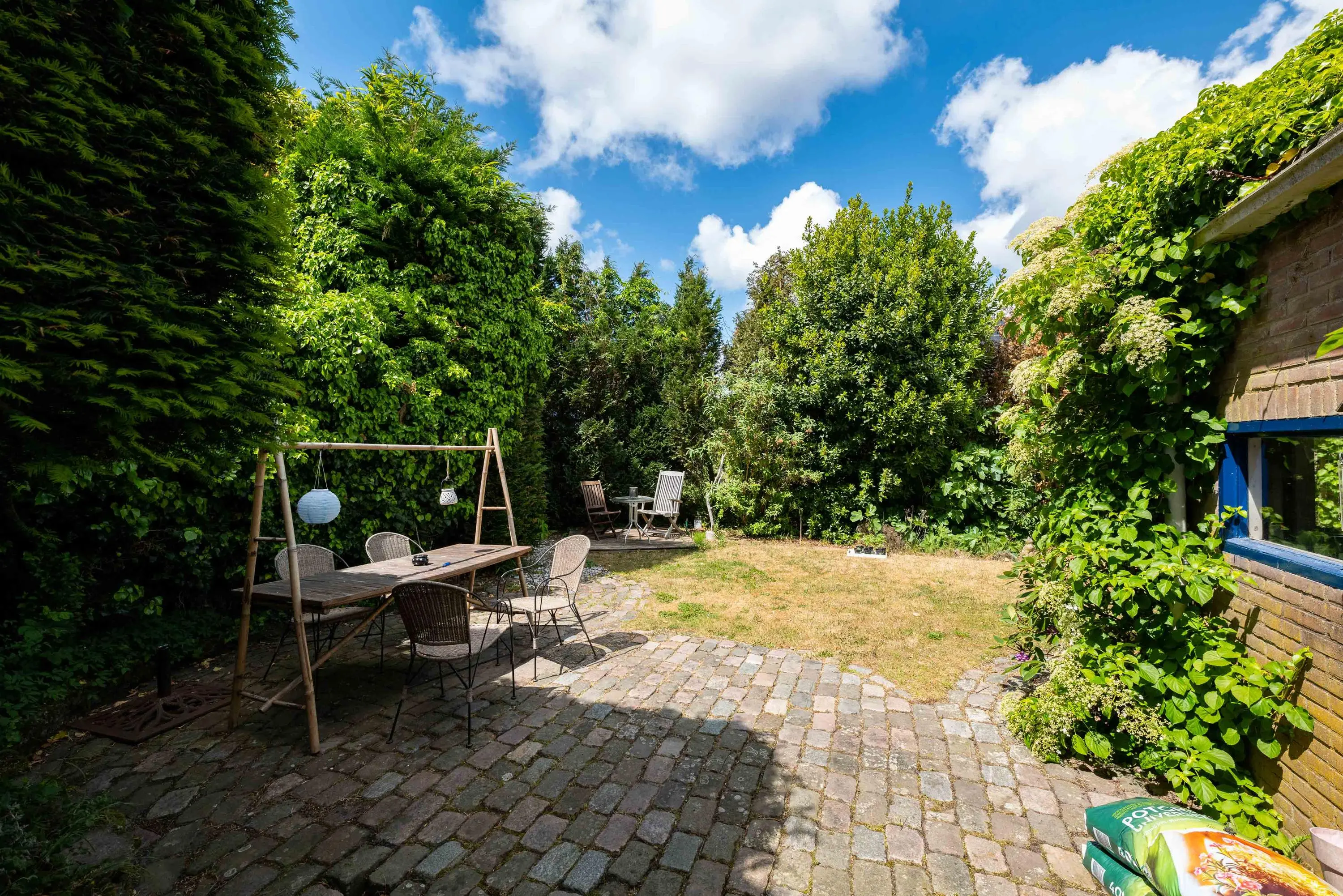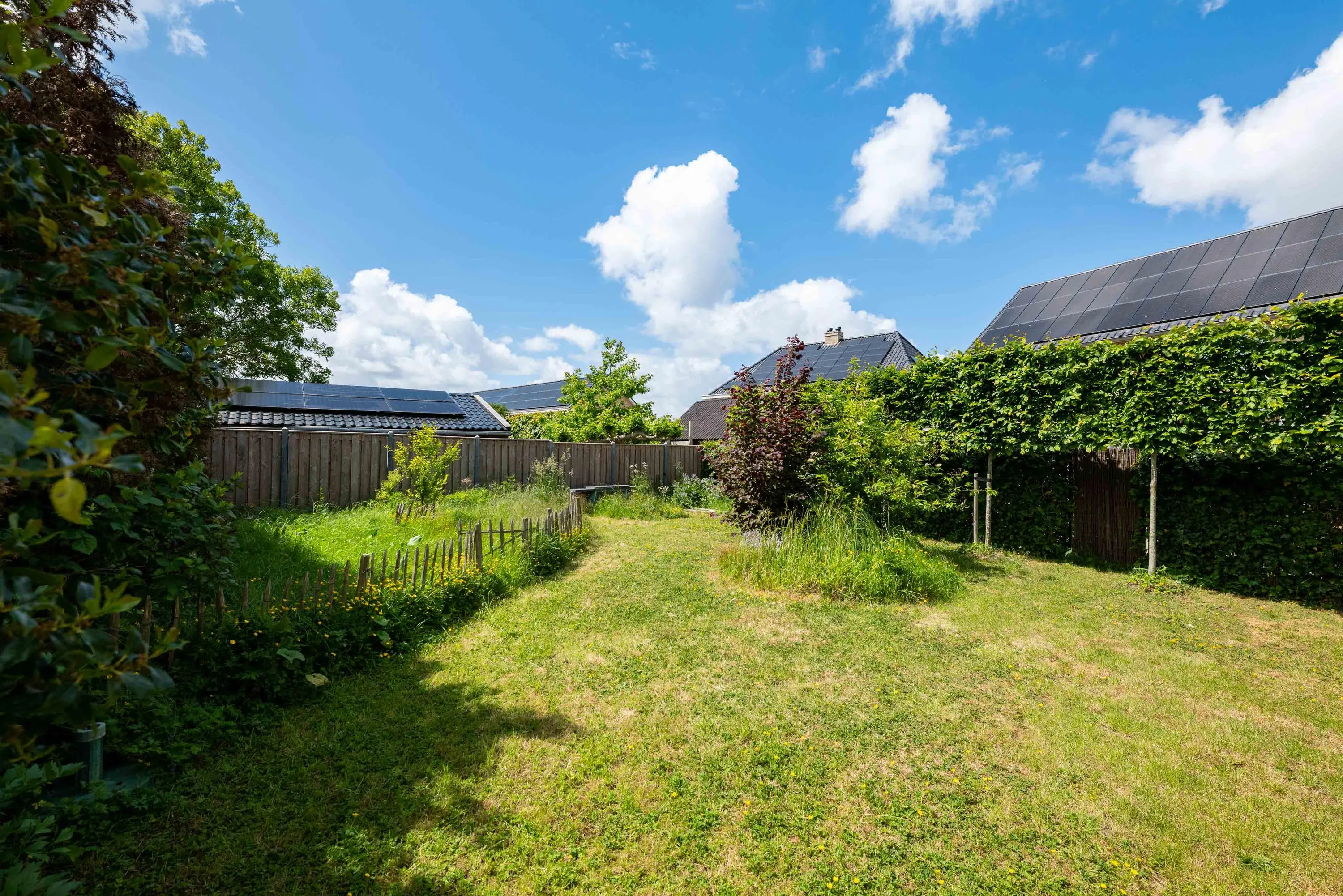 De grote achtertuin is ingericht met een gazon, terrassen, houtopslag en enkele bomen. Dat geeft dit huis een extra reden om fijn te kunnen wonen.